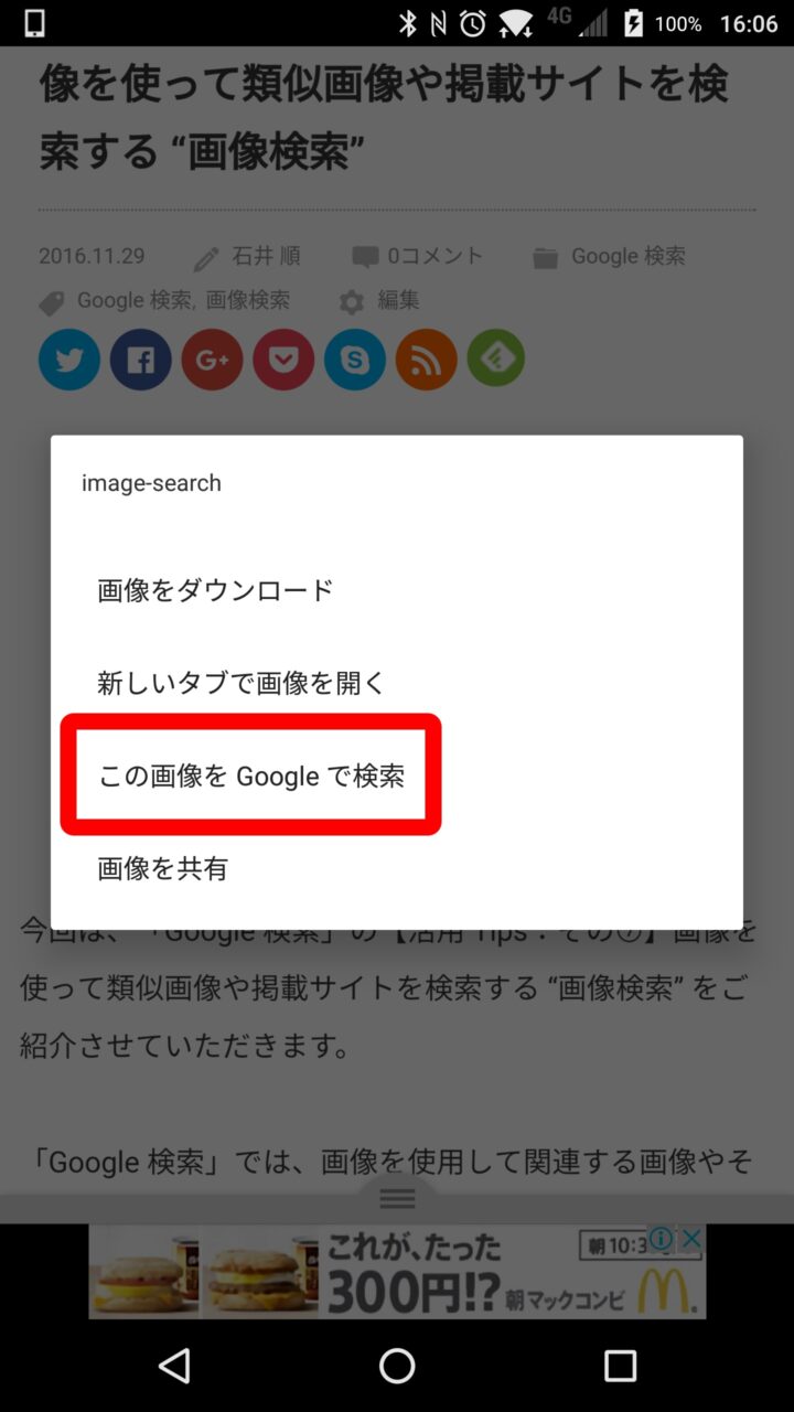 スマートフォン用「Chrome」アプリで “画像検索” を行う方法は、キーワード検索を行ったり WEB サイトを開いて画像を表示し、検索元とする画像を長押しします。するとメニューが表示されるので “この画像を Google で検索” をタッチします。これで “画像検索” が行われます。