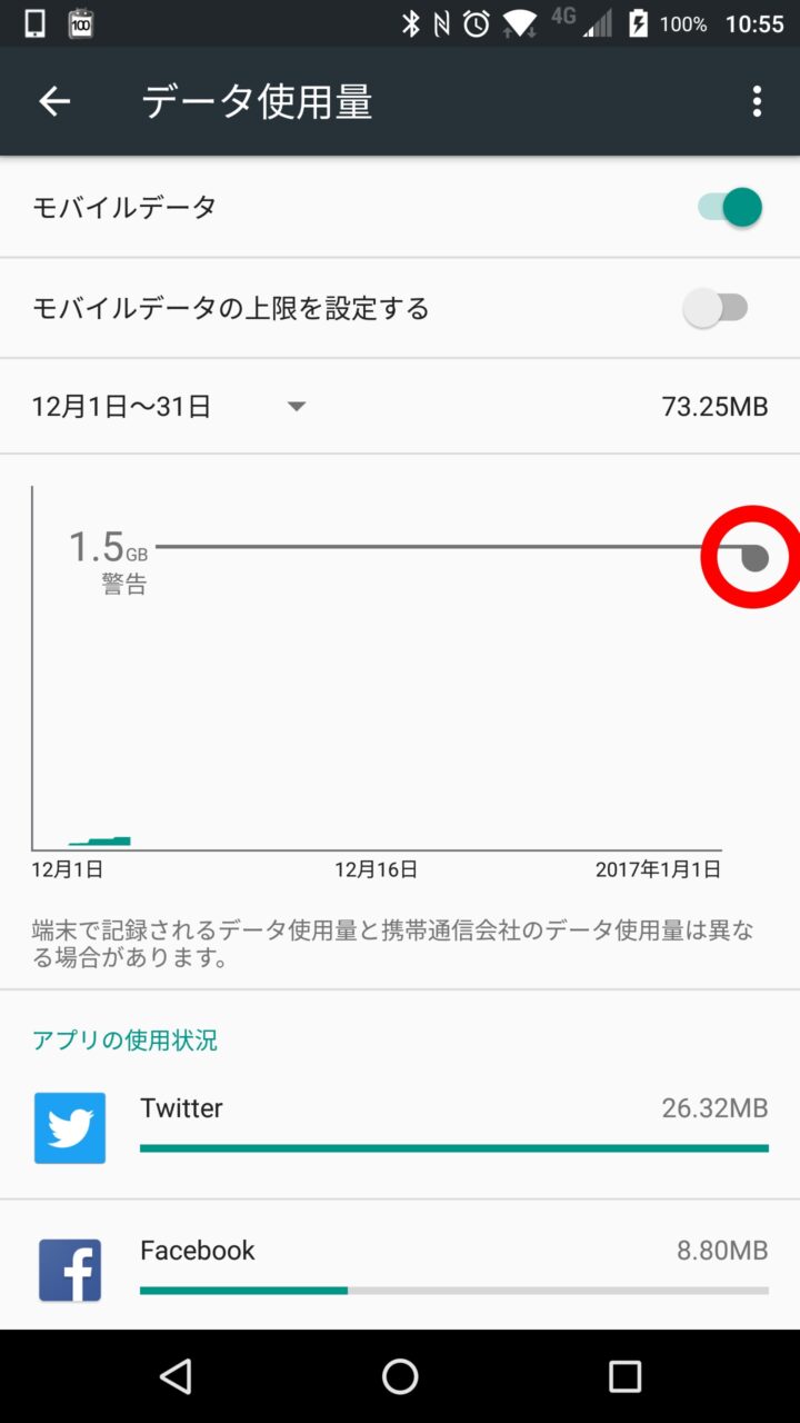 この設定をしておくことで、指定したサイクルの期間中にモバイルデータ通信が設定量に達した場合、通知バーに警告が表示されるようになります。あくまでも警告なのでモバイルデータ通信が オフ になるわけではありませんが、残りのサイクル期間を考慮しつつ、モバイルデータ通信節約の意識付けにつながるかと思います。是非設定しておきましょう。