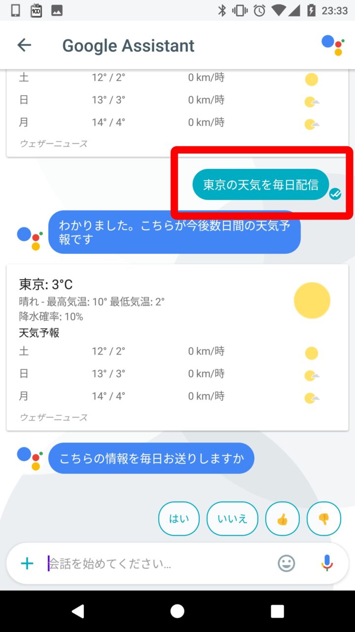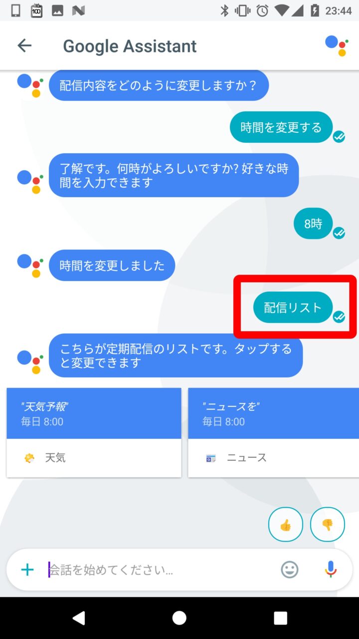 時間を設定したら完了です。これで設定した時間に設定した情報が、「Google Allo」の「Google Assistant」のチャットとして配信されるようになります。
