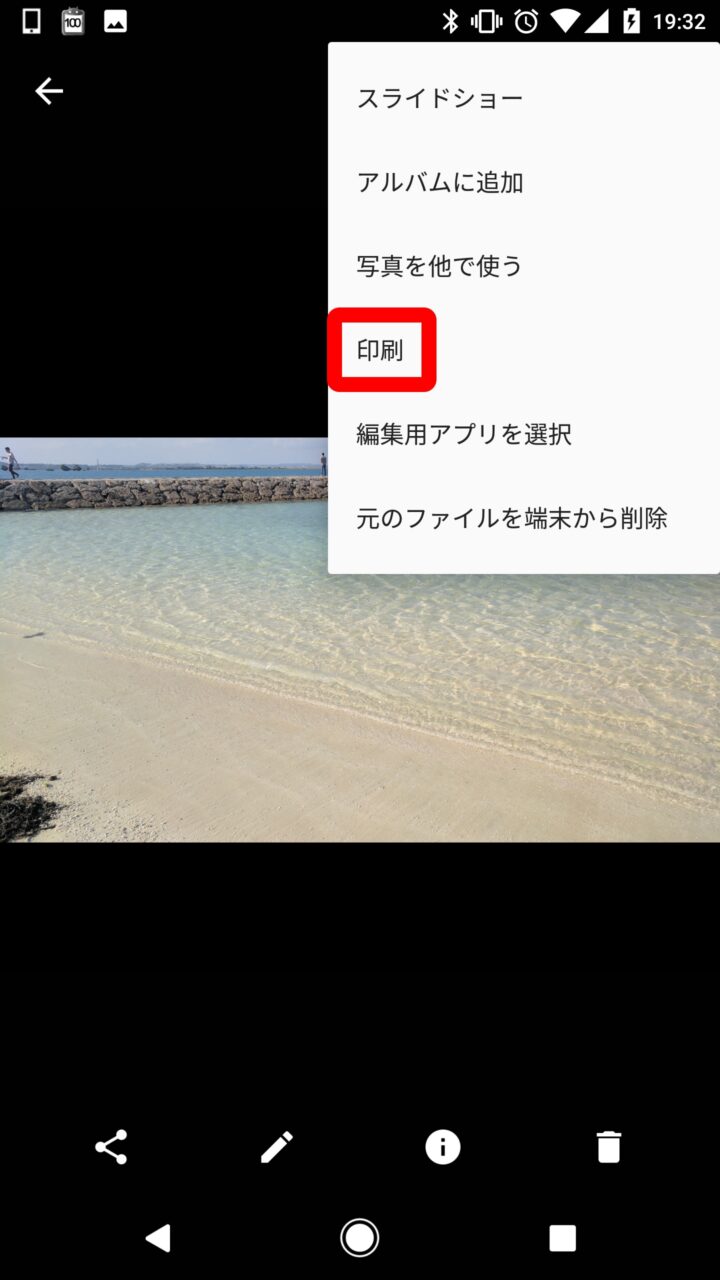 Android で写真や WEB ページを PDF 形式で保存する方法は、保存する写真や WEB ページをまず表示します。写真の場合は、写真を表示するアルバムアプリにもよりますが、メニューなどで表示される “印刷” をタッチします。