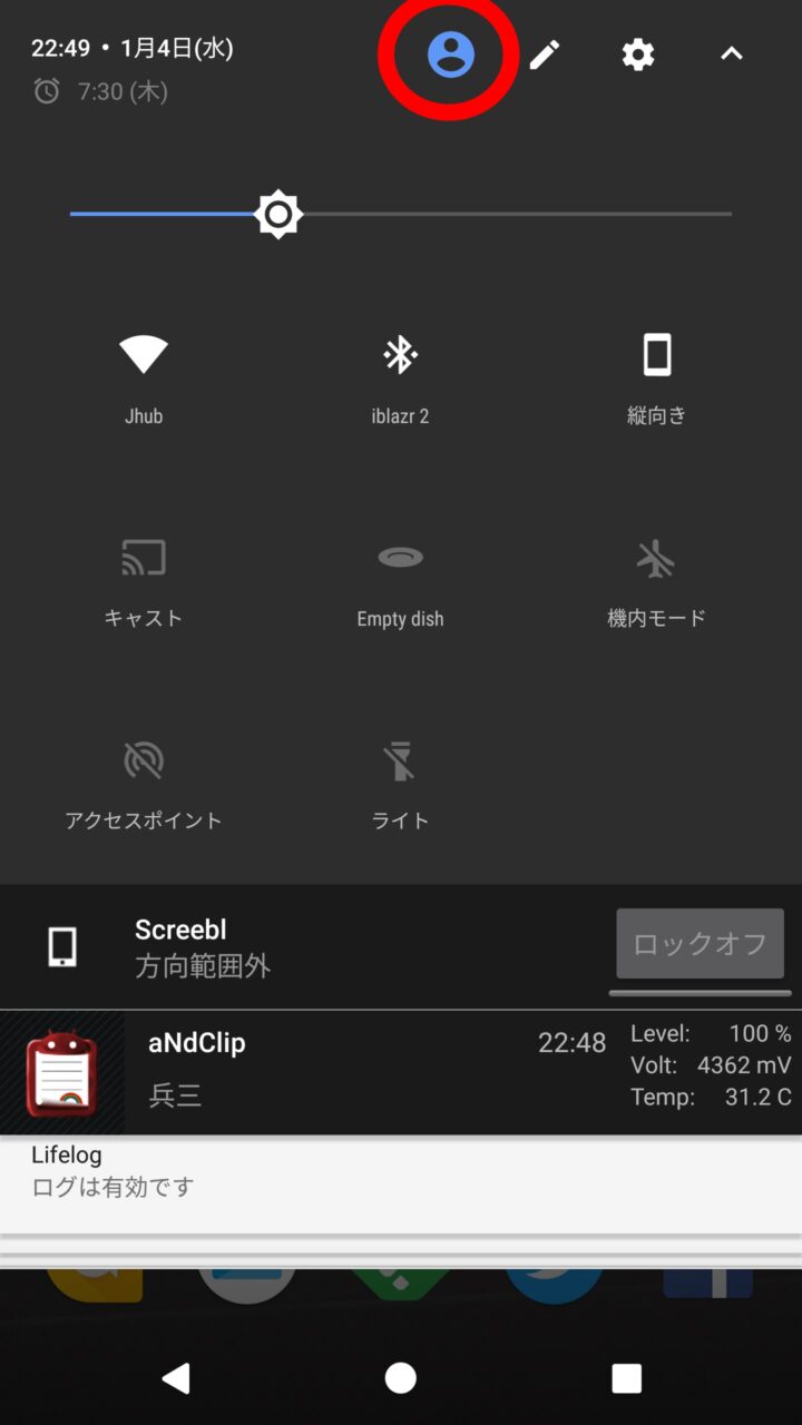 “ゲスト” セッションに切り替える方法は、Android の通知領域をスワイプなどで開き、人物アイコンをタッチします。