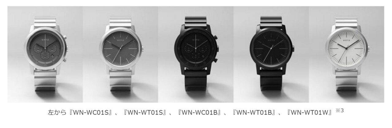 「wena wrist」のバリエーションはクロノグラフとスリーハンズの 2 種類で、クロノグラフがシルバーとプレミアムブラック、スリーハンズがシルバー、プレミアムブラックに加え、限定色のホワイトが用意されます。