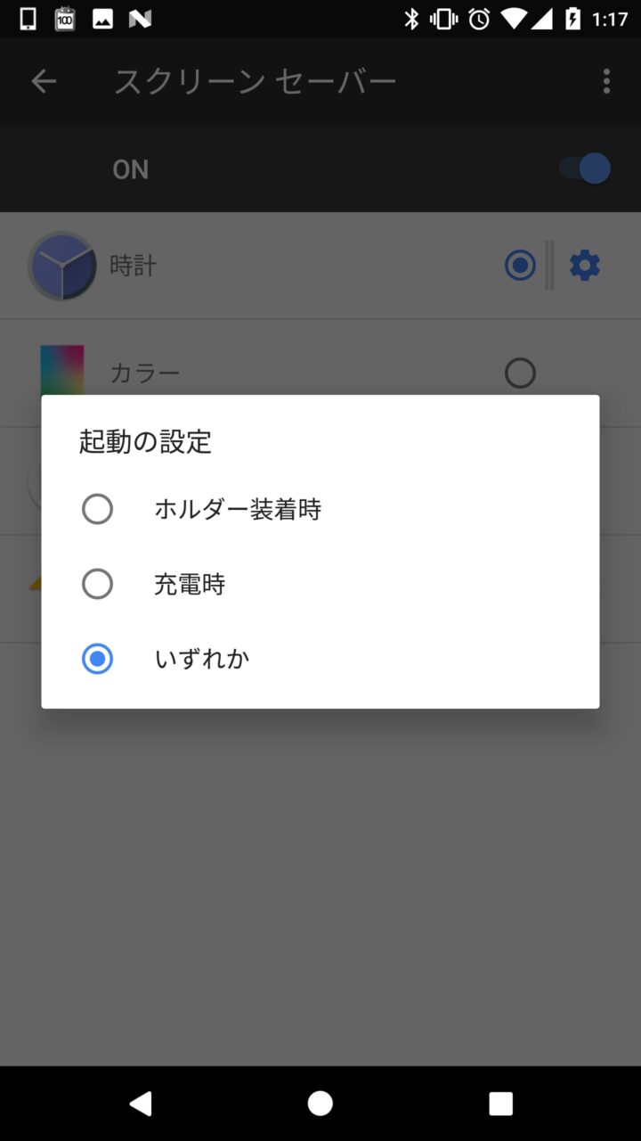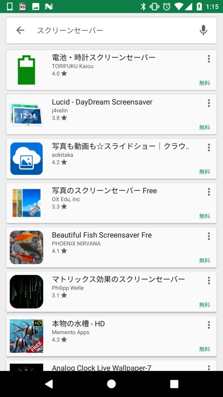また “スクリーンセーバー” はデフォルトで “時計” “カラー” “ニュースと天気” “フォト(Google フォト)” の 4 つが用意されていて、更に Google Play から “スクリーンセーバー” 用のアプリをインストールして設定することもできます。