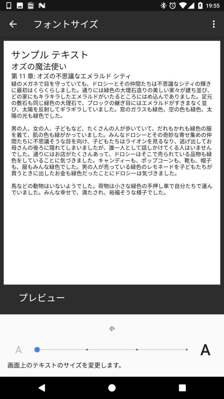 “表示サイズ” の変更は 5 段階で行うことができます。スライダー部分をタッチして変更することでそれに合わせてプレビューも表示されるので、自分に合った大きさを選択してみてください。
