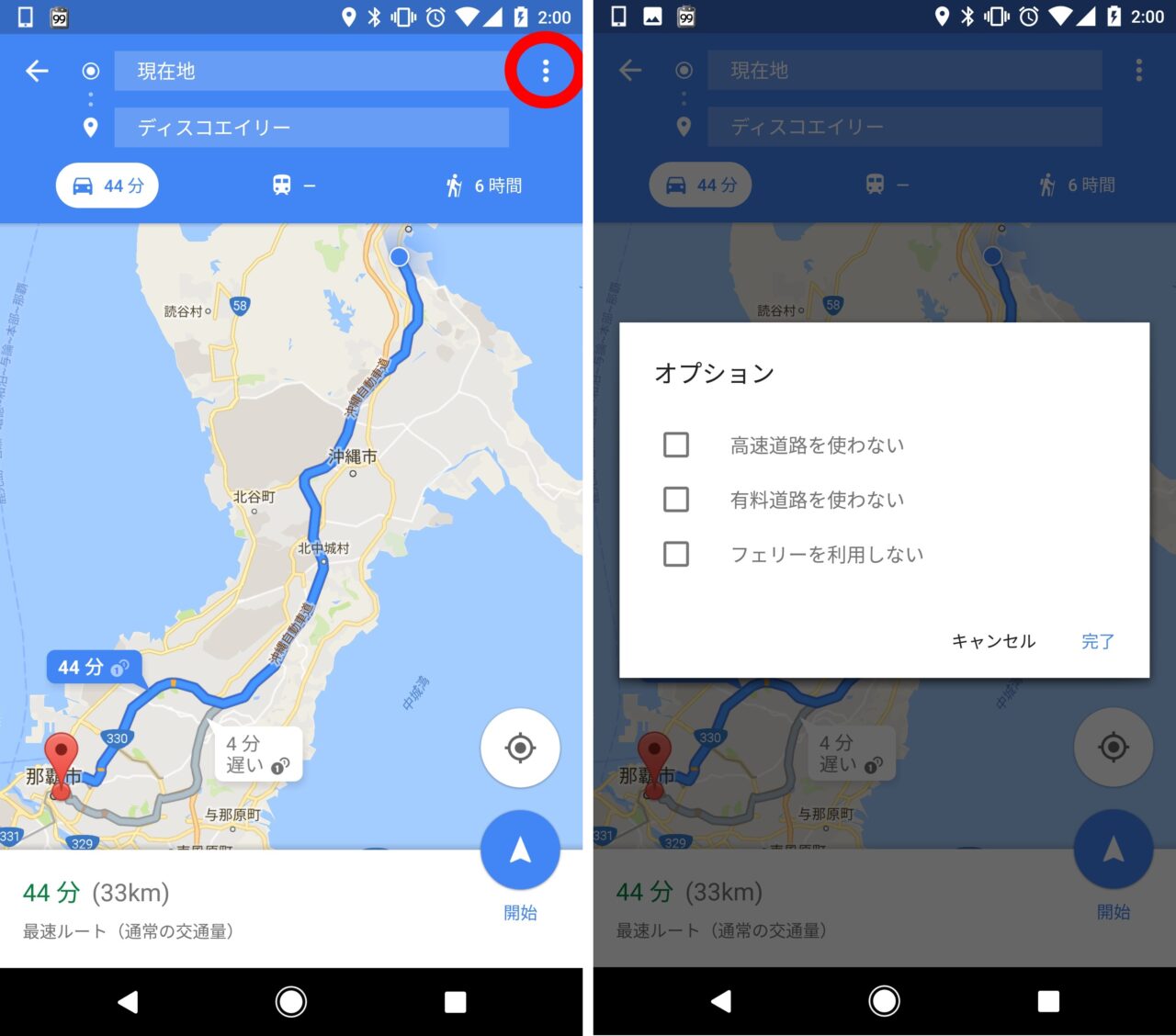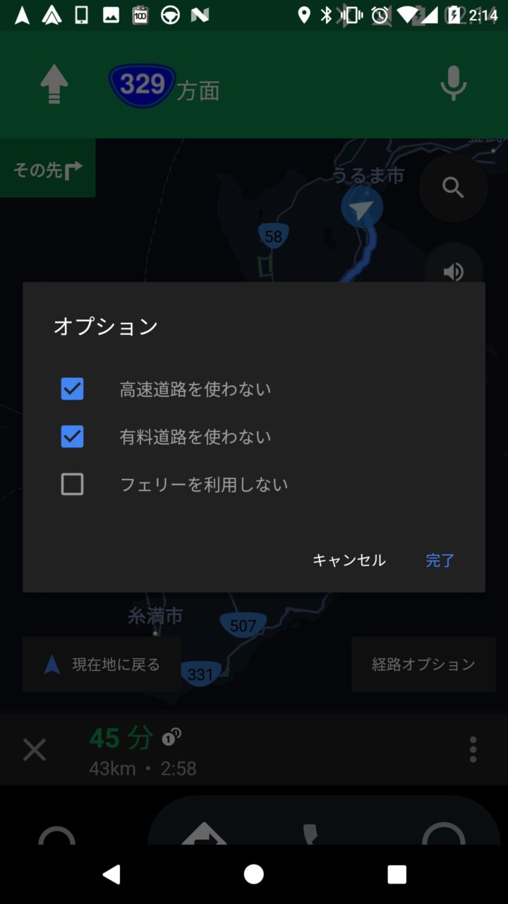 すると経路の全体画像に切り替わり “経路オプション” がここで表示されます。高速道路や有料道路を利用しない場合は、該当する項目にチェックを入れて “完了” をタッチすると、選択した項目が考慮された経路が再設定されます。