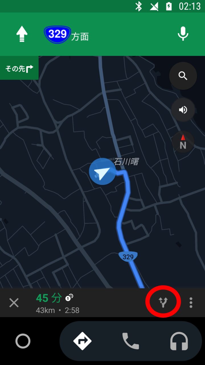 「Android Auto」のカーナビゲーションで高速道路や有料道路を利用しないようにする設定の “経路オプション” を開くにはまず、目的地を設定してナビゲーションを開始します。ナビゲーションが開始されると表示される画面右下の経路アイコンをタッチします。