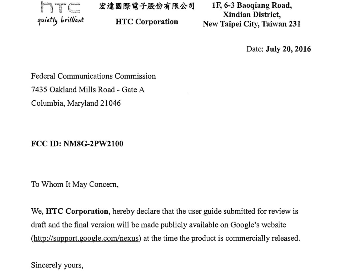 HTC 製 Nexus スマートフォン「G-2PW2100 / G-2PW4100」が、8 月 15 日付けで FCC の認証を取得しました。