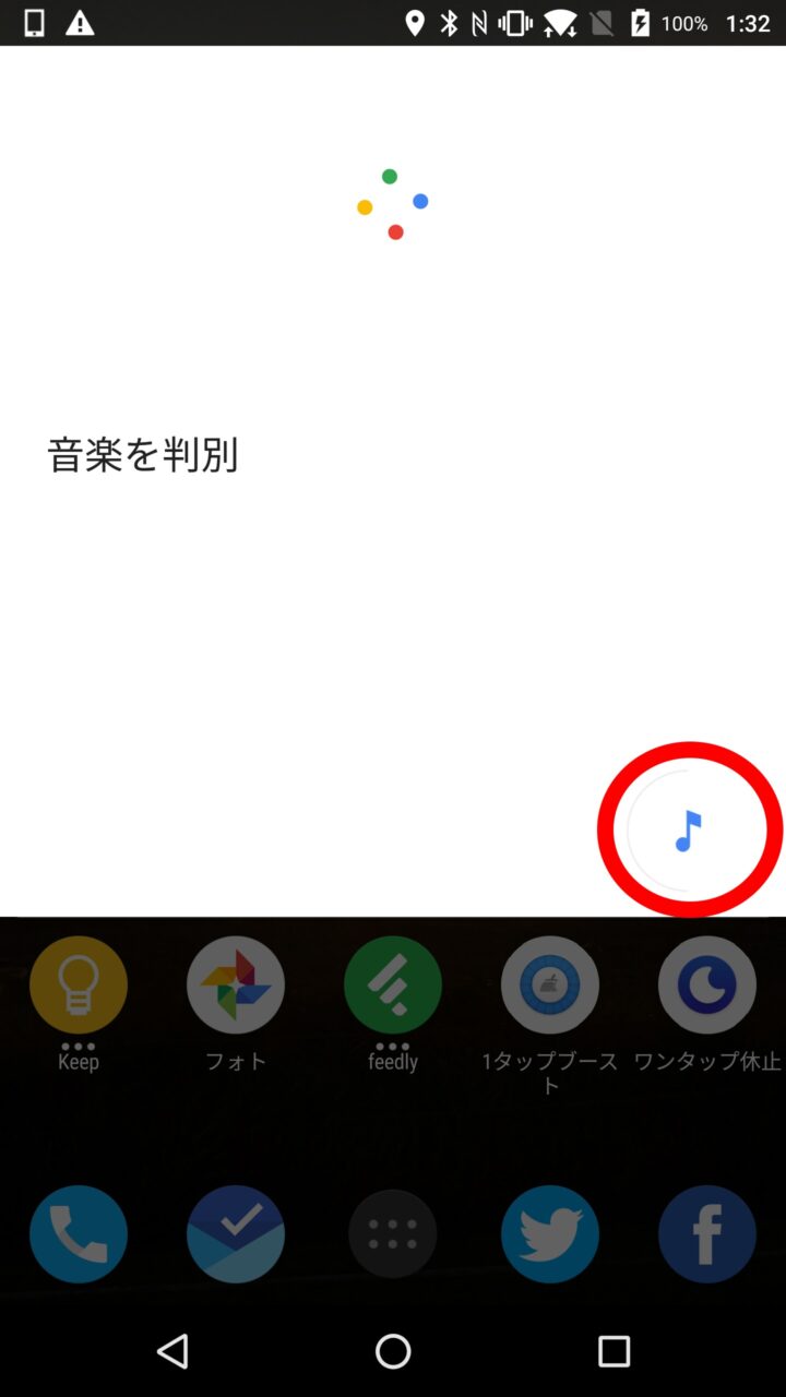 Android に実装されている “Google Sound Search” の使い方は、まず「Google アプリ」で音声検索待ち受け状態にして、Android に付近で流れている音楽を聞かせます。すると右下に “♪” アイコン表示されるので、そのアイコンをタッチします。