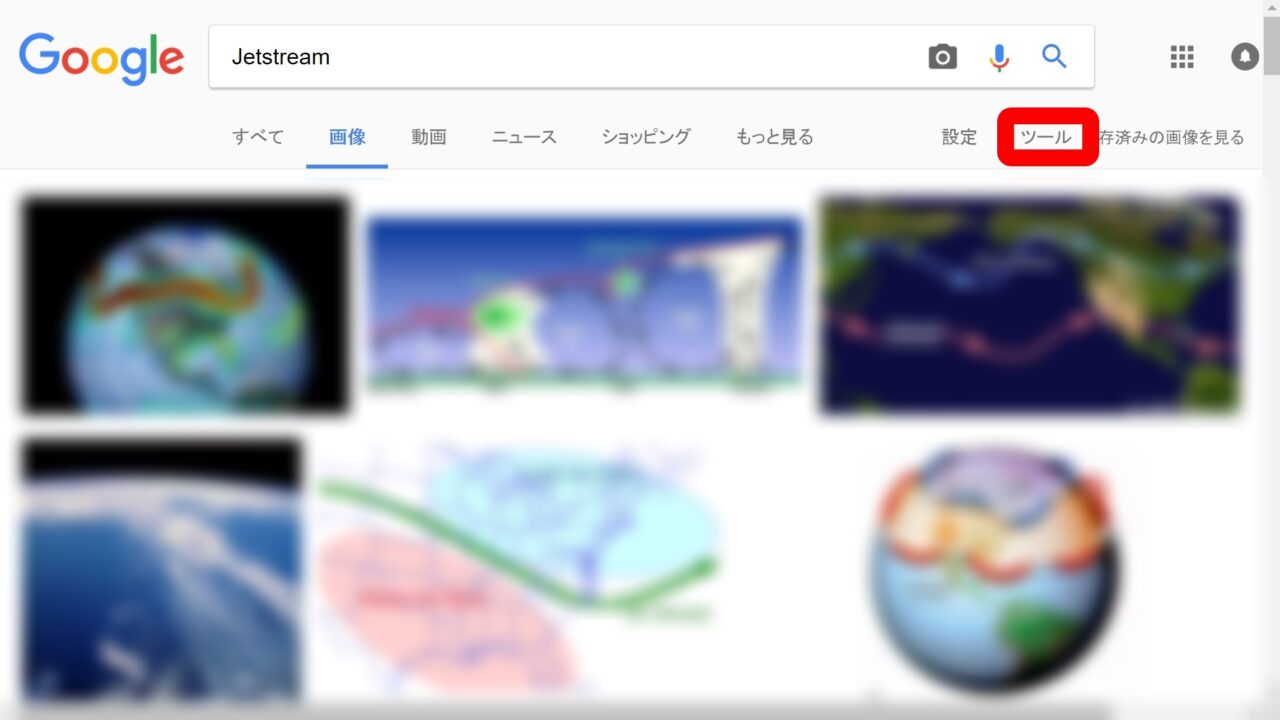 「Google 画像検索」で “ライセンスフィルタリング” 機能を利用する検索は、まず通常通り画像検索を行います。そして表示される検索結果ページの “ツール” をクリックします。
