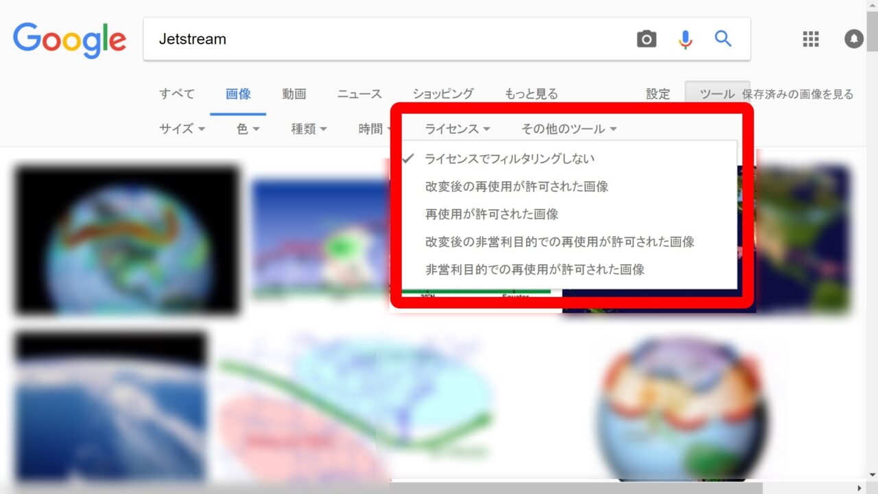 つまり最初の画像検索の段階では “ライセンスでフィルタリングしない” での検索結果となるので、著作権が設定されている画像をダウンロードして SNS に投稿したりブログで利用するなどしてしまうと危険です。そのためほかの 5 つのメニューから任意のメニューを選んでクリックします。