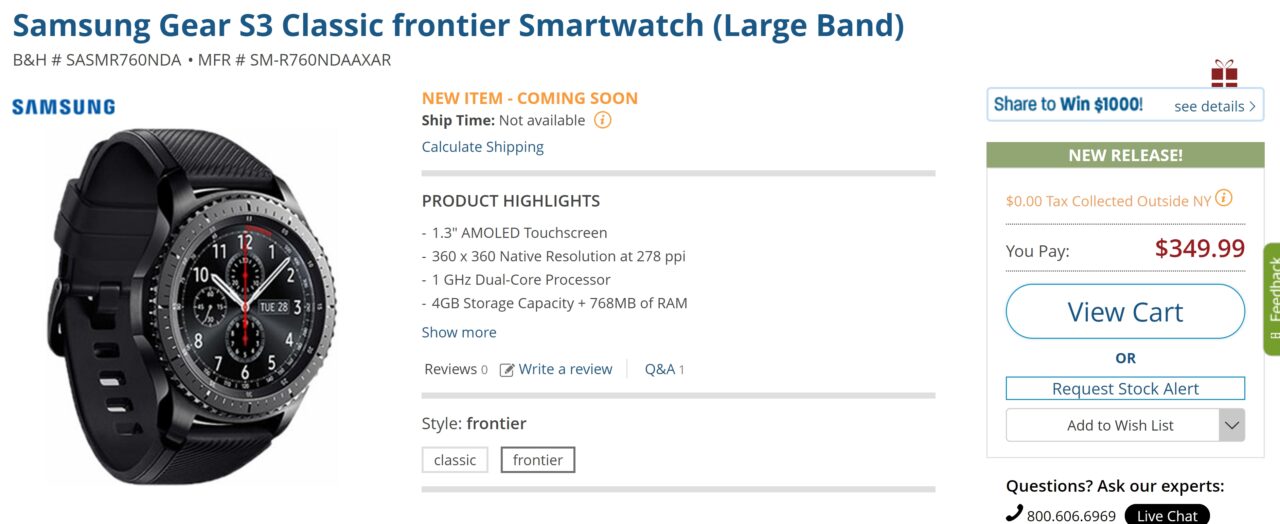 日本直送に対応している米国の通販サイト B&H が、Samsung の新型スマートウォッチ「Gear S3 Frontire / S3 Classic」の予約を開始しました。発売日は未定ですが、Samsung 公式によるとグローバルマーケットにおける展開開始は 11 月 18 日なので、それ以降の発売となると予想されます。