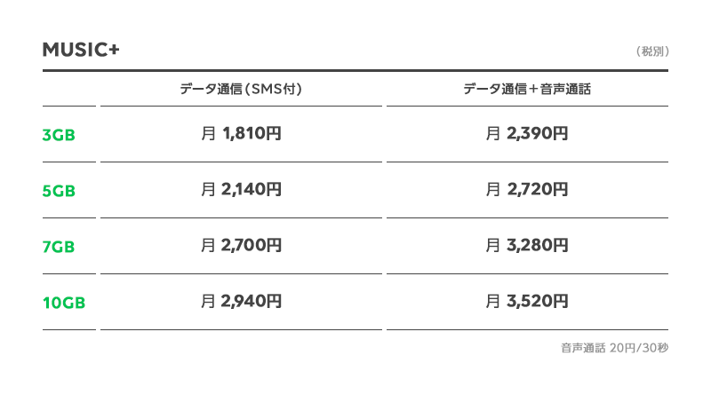 「MUSIC+ プラン」の料金は、3GB のデータ通信プラン(SMS 付)1,810 円からです。音声通話付プランでも利用することができます。