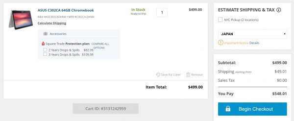 B&H では「Chromebook Flip C302CA」の発表とほぼ同時に発売されたのですが、すぐに在庫切れとなってしまっていました。現在は Amazon.com でも在庫切れとなっているので、B&H は現時点での有力な直輸入ルートとなるかと思います。
