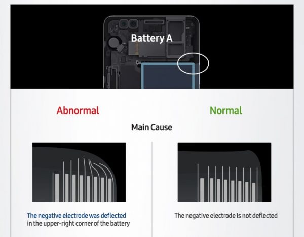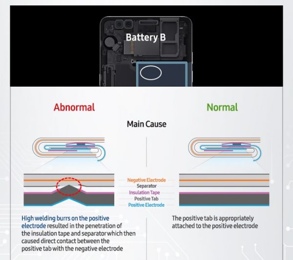Samsung によると、今回の「Galaxy Note7」発火事故の原因はバッテリーの構造による問題だった模様です。また「Galaxy Note7」用のバッテリーは 2 つの異なるメーカーが担当していたのですが、それぞれ異なる部分に欠陥が見つかり結果的に発火に至ったとしています。また欠陥部分については、内部干渉によりパーツの変形や常な突起が挙げられています。