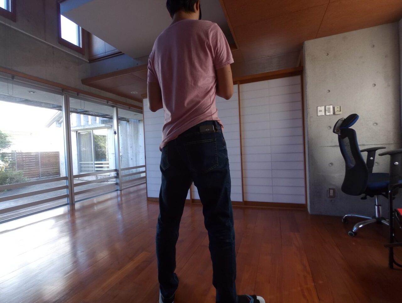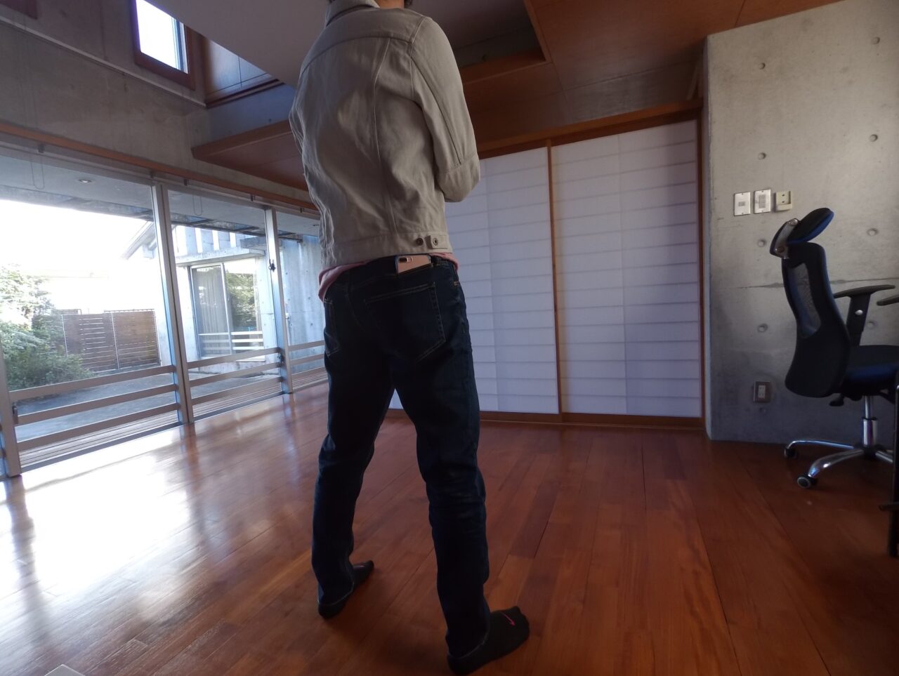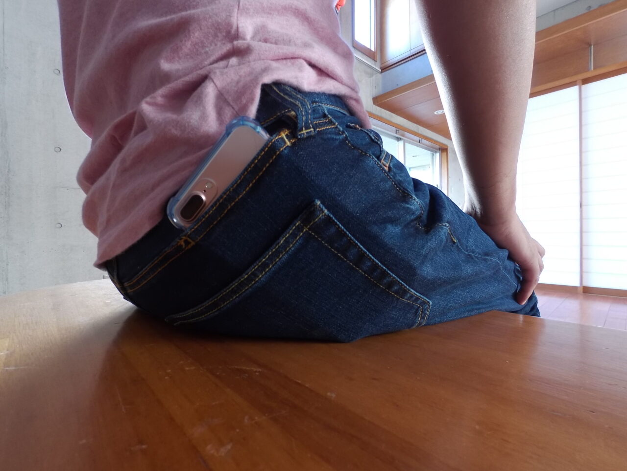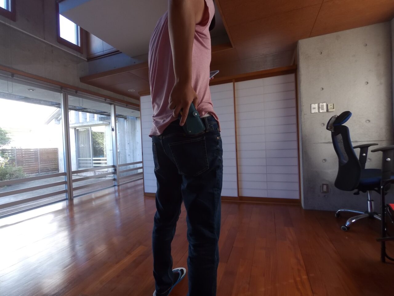 「iPhone 7 Plus」を収納したまま座ってみたのですが、「iPhone 7 Plus」の底面が椅子と “コツン” と接触はしたものの、お尻の下敷きにならずに丁度良い感じでホールドされました。下の画像の後ろポケットの位置と比べると、第 6 のポケットの効力がはっきりとわかるかと思います。