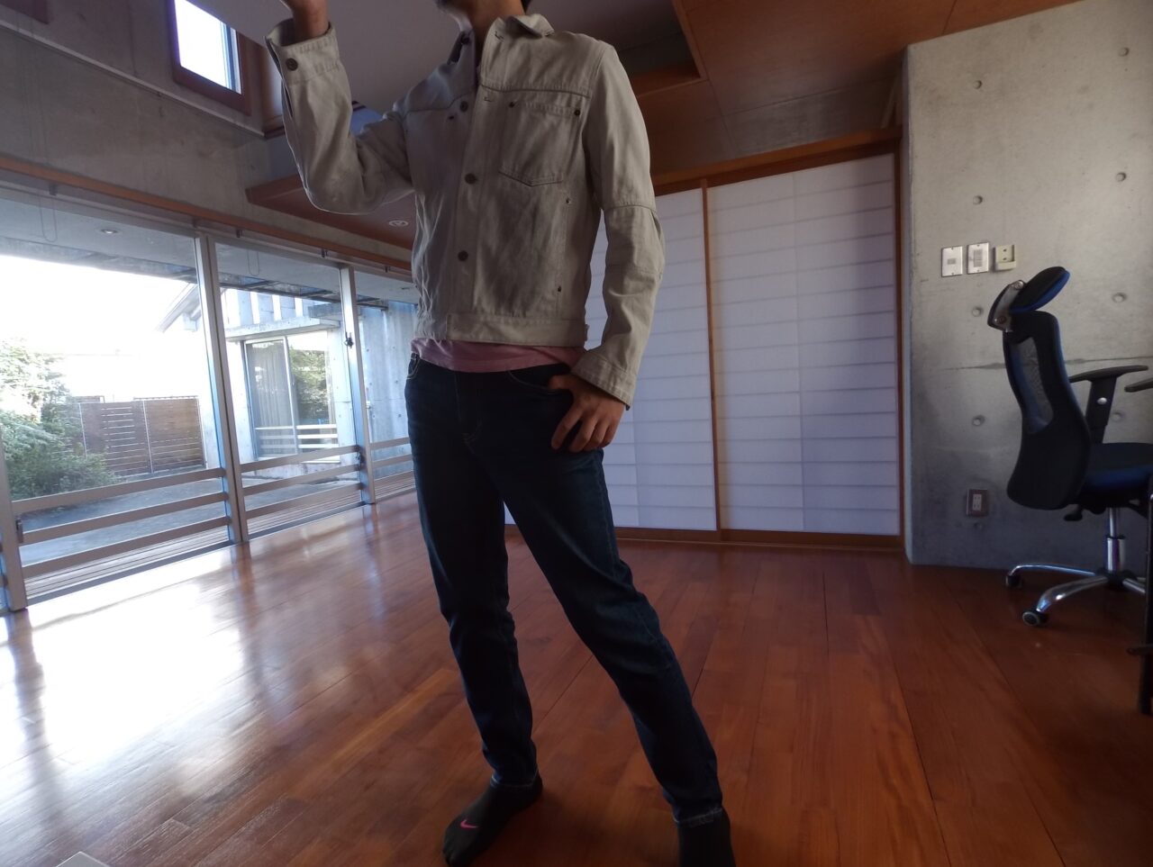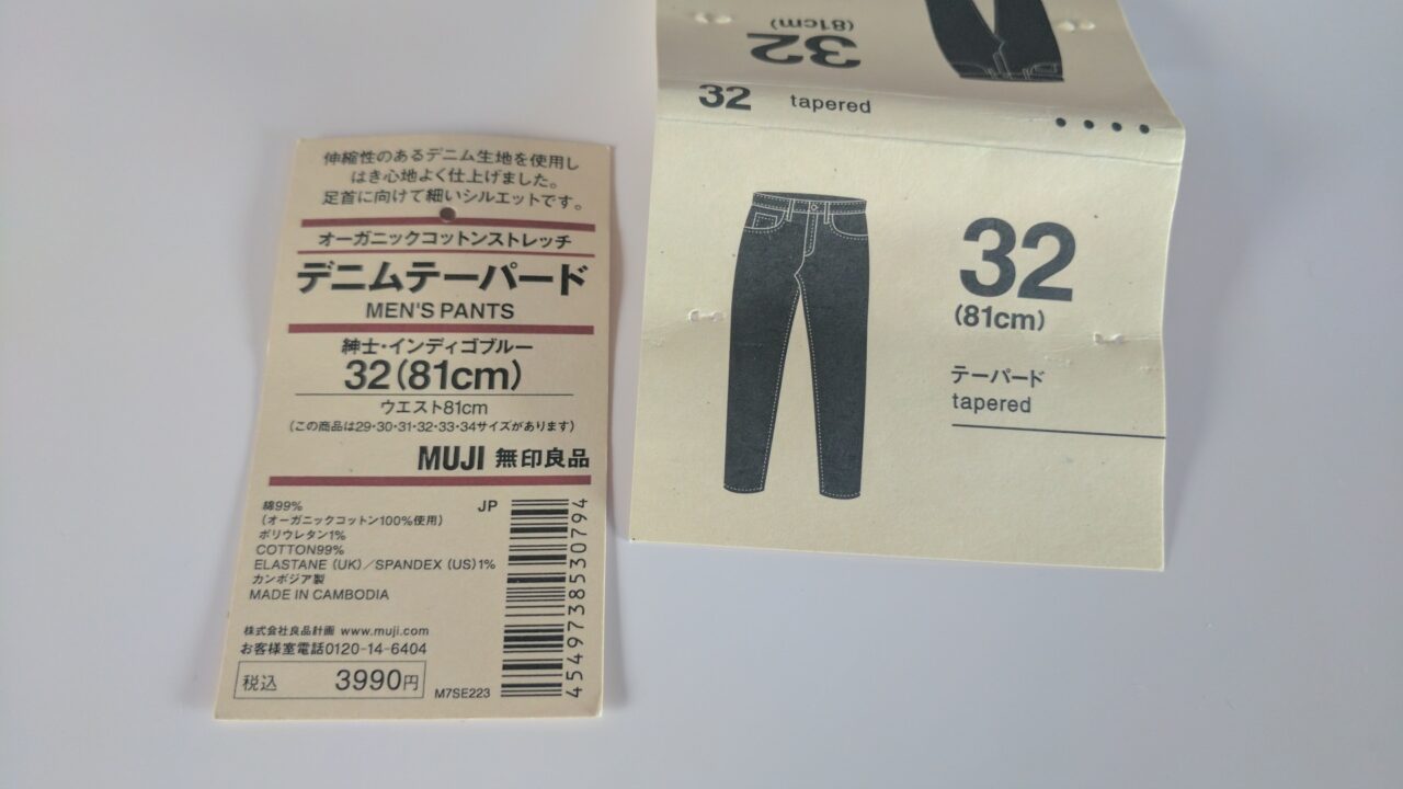 その中で私は、(当たり前ですが)メンズラインで一番太いシルエットとなる “テーパード” の “インディゴブルー / 32 インチ” をチョイス。“テーパード” が一番太いといってもダボダボではなく、腰と腿周りは少しゆとりがあるものの、足先に向かってスリムになっていくデザインです。現代のメンズファッションではトレンドなシルエットですね。