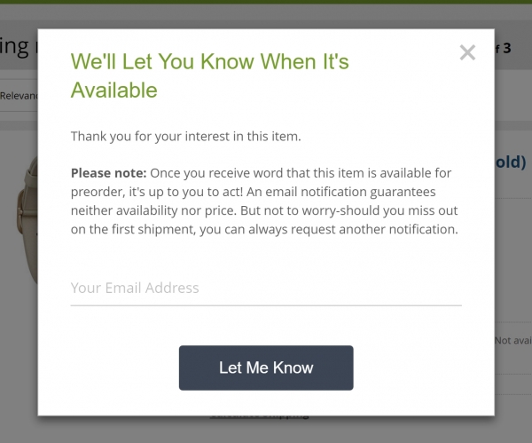 メールフォームは日本からでも登録可能なので、「LG Watch Style」の B&H への入荷情報を知りいたい方は登録してみてはいかがでしょうか。登録は各ページの “Notify When Available” をクリックし、表示されるウィンドウにメールアドレスを入力して “Let Me Know” ボタンを押すだけと簡単です。