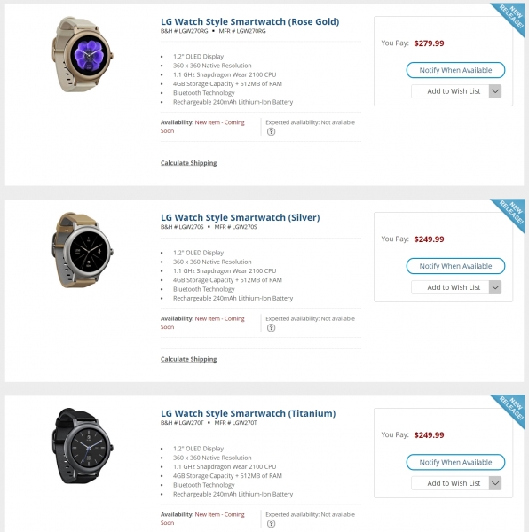 米国のカメラ & ビデオ機器量販店 B&H が本日発表された Android Wear 2.0 を初期搭載するスマートウォッチ「LG Watch Style」の商品ページを公開しました。