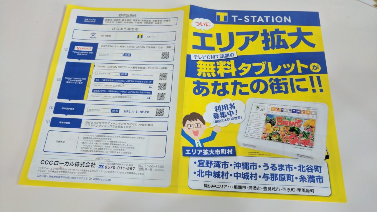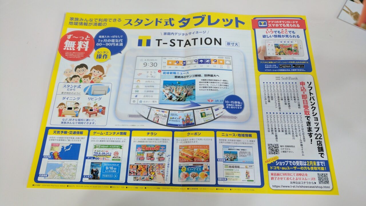 CCC グループが提供する「T-Station」サービス対応のタブレット「T ステーション」を 20,000 世帯限定で無料でもらえる、というか半永久的に貸し出してもらえる、地域限定のサービスですね。沖縄とか那覇周辺の情報を表示してくれるみたいです。