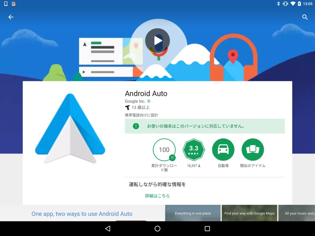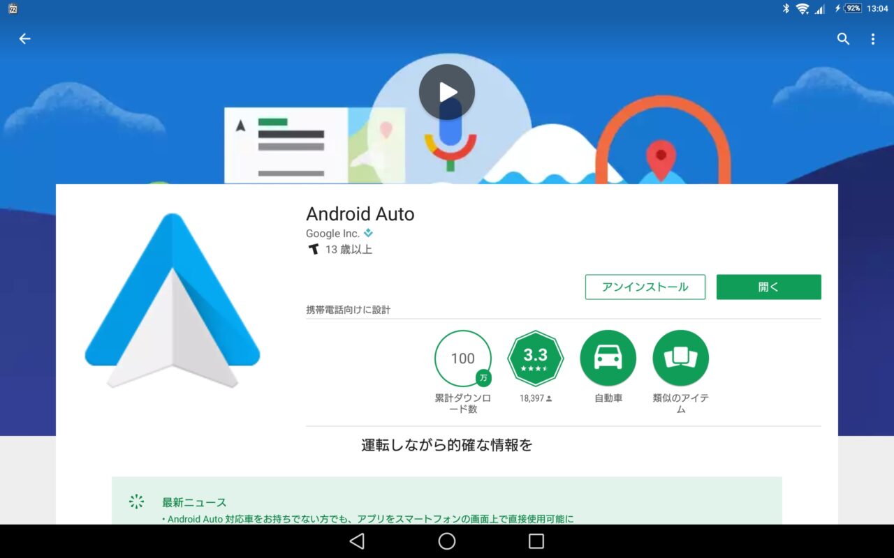 「Android Auto」をタブレットで利用する場合、Google Play からタブレットにインストールすらできなかったので APK ファイルでインストールする必要がありました。