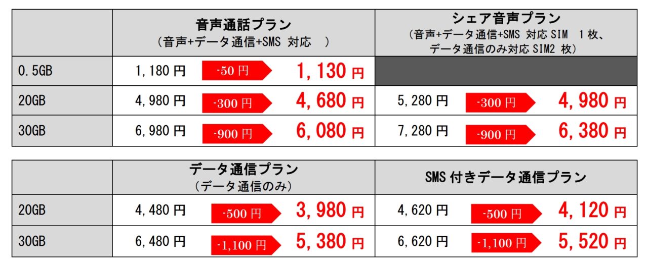 一部プランの値下げは 20GB と 30GB の大容量プラン、そして音声通話プランの 0.5GB で実施されます。0.5GB プランは 50 円の値下げですが、20GB プランは 300 円、さらに 30GB プランでは 900 円もの値下げです。