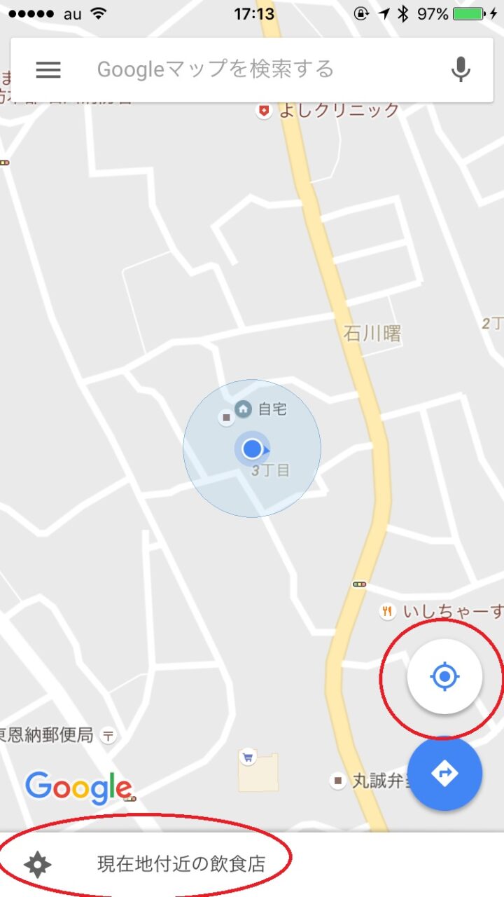 「Google マップ」の周辺のスポット機能の使い方は、「Google マプ」を開き、右下の現在地アイコンをタッチして、まず現在地を取得します。
