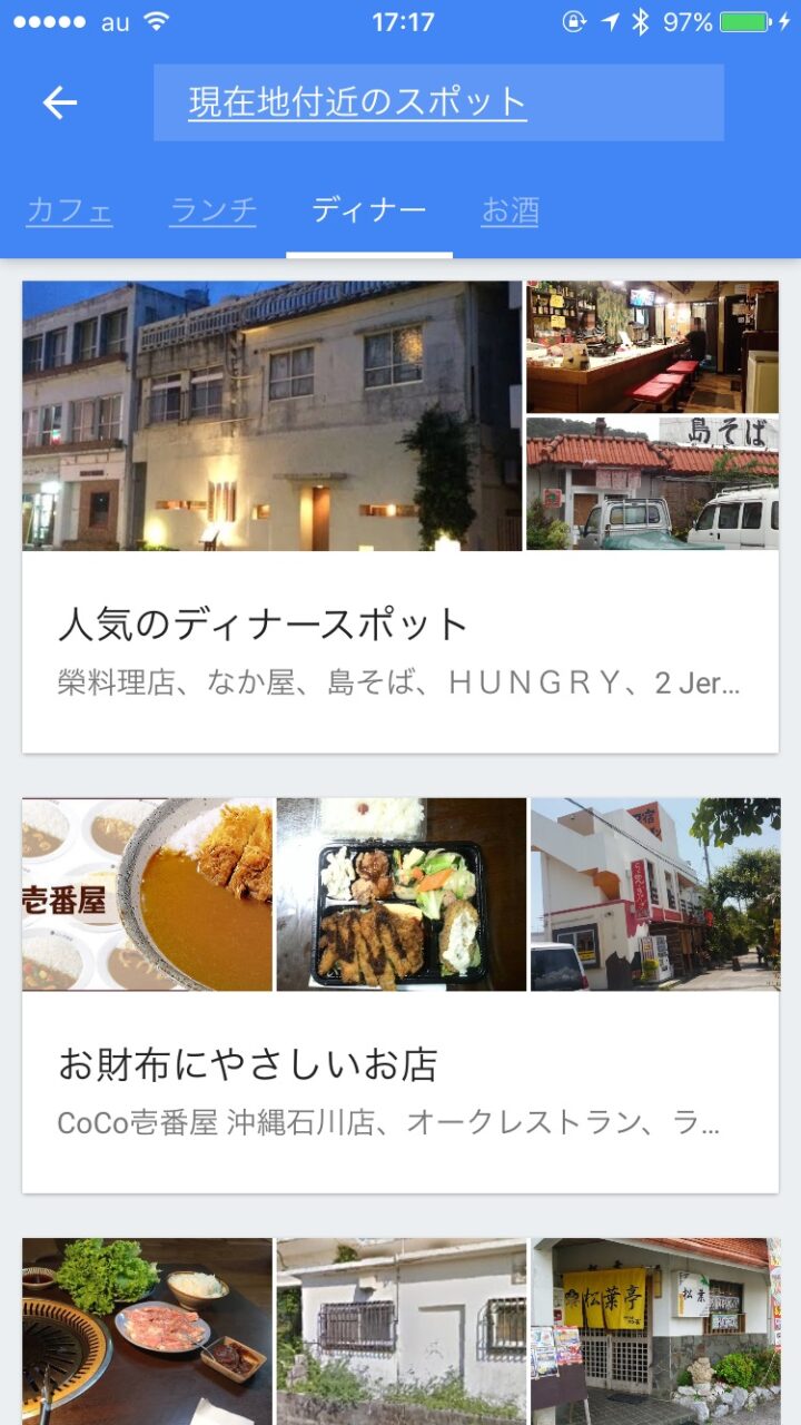 すると周辺のスポットが一覧で表示されるのですが、iPhone の場合は Android の横 UI ではなく、縦 UI 各お店の条件カテゴリが表示されます。