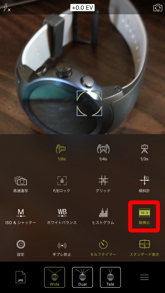 早速「ProCamera」を起動してアスペクト比を 4:3 から 16:9 に変更。