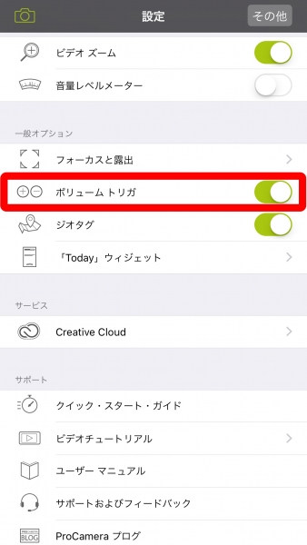 これでボリュームボタンシャッターを有効になり、「ProCamera」での「bitplay SNAP! 7」を装着したシャッターボタン撮影ができるようになります。