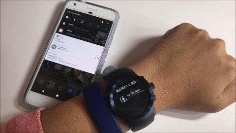 母艦機側の「Spotify」が起動し楽曲の再生を開始しました。つまり現時点で Android Wear 2.0 版「Spotify」アプリは、単なる母艦機の簡易リモート再生用としてしか利用できない模様です。しかも再生はできるもののそれ以外の一時停止や早送りなどの操作すら行うことはできませんでした。つまりは『それだけかよ』って感じ。