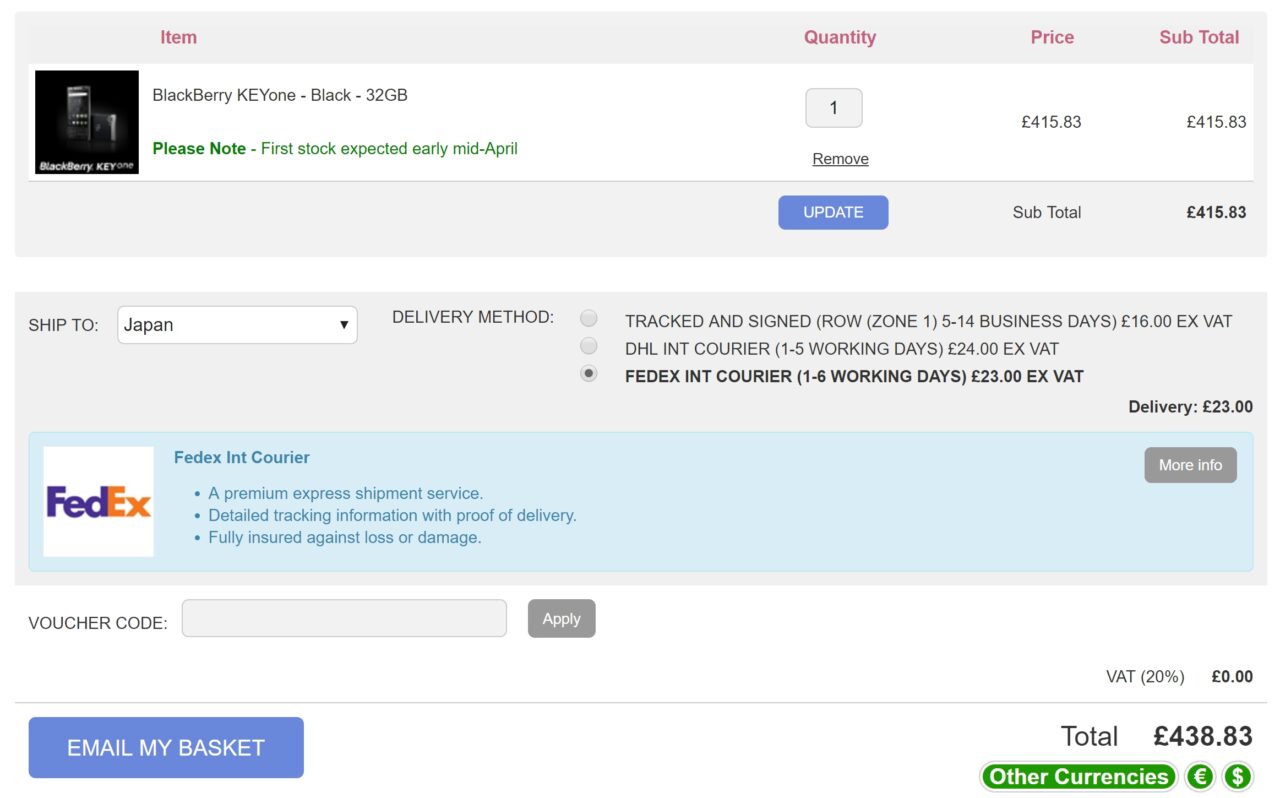 Cloveでの「BlackBerry KEYone」の本体価格は(今のところ)VAT 抜き £415.83 です。送料と国内到着時の消費税を考慮した輸入総額は以下の通り。
