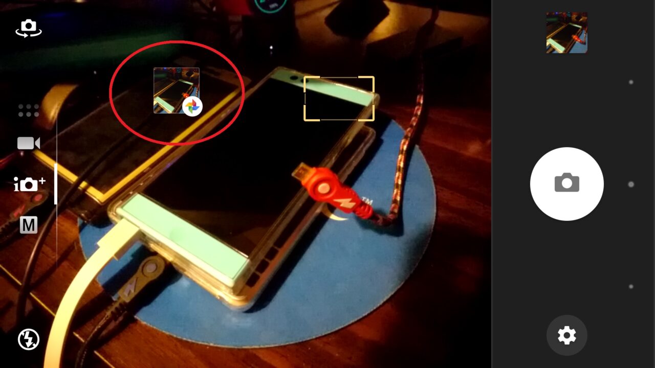 設定後に Android のカメラで撮影を行うと、ディスプレイ上に「Google フォト」のアイコンとサムネイルが表示されるようになります。