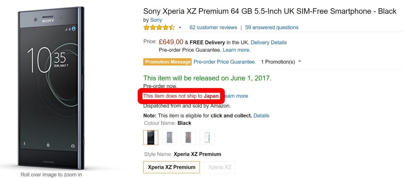 Amazon.co.uk での「Xperia XZ Premium」の本体価格は VAT 込 £649 です。この価格での概算の輸入総額は以下の通りとなります。ただし実際には発売時の為替が適用されるので、あくまでも目安です。