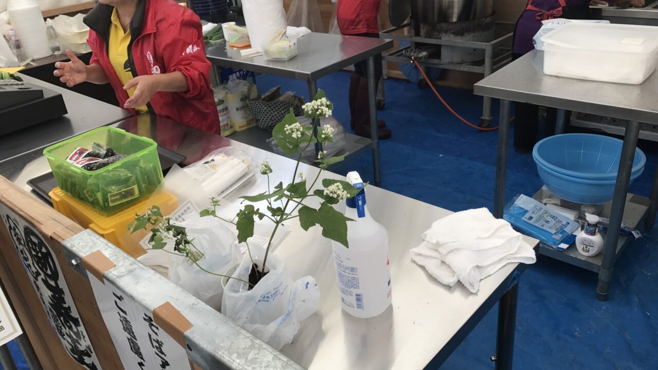 会場のブースも、温かいかけそばを提供してくれるテントと、「和そば」を使用して作られたほかの特産品がちょこっと売っているブースがある程度。それにかけぞばを食べる用の会議テーブル 2 個と椅子が 15 席程度。