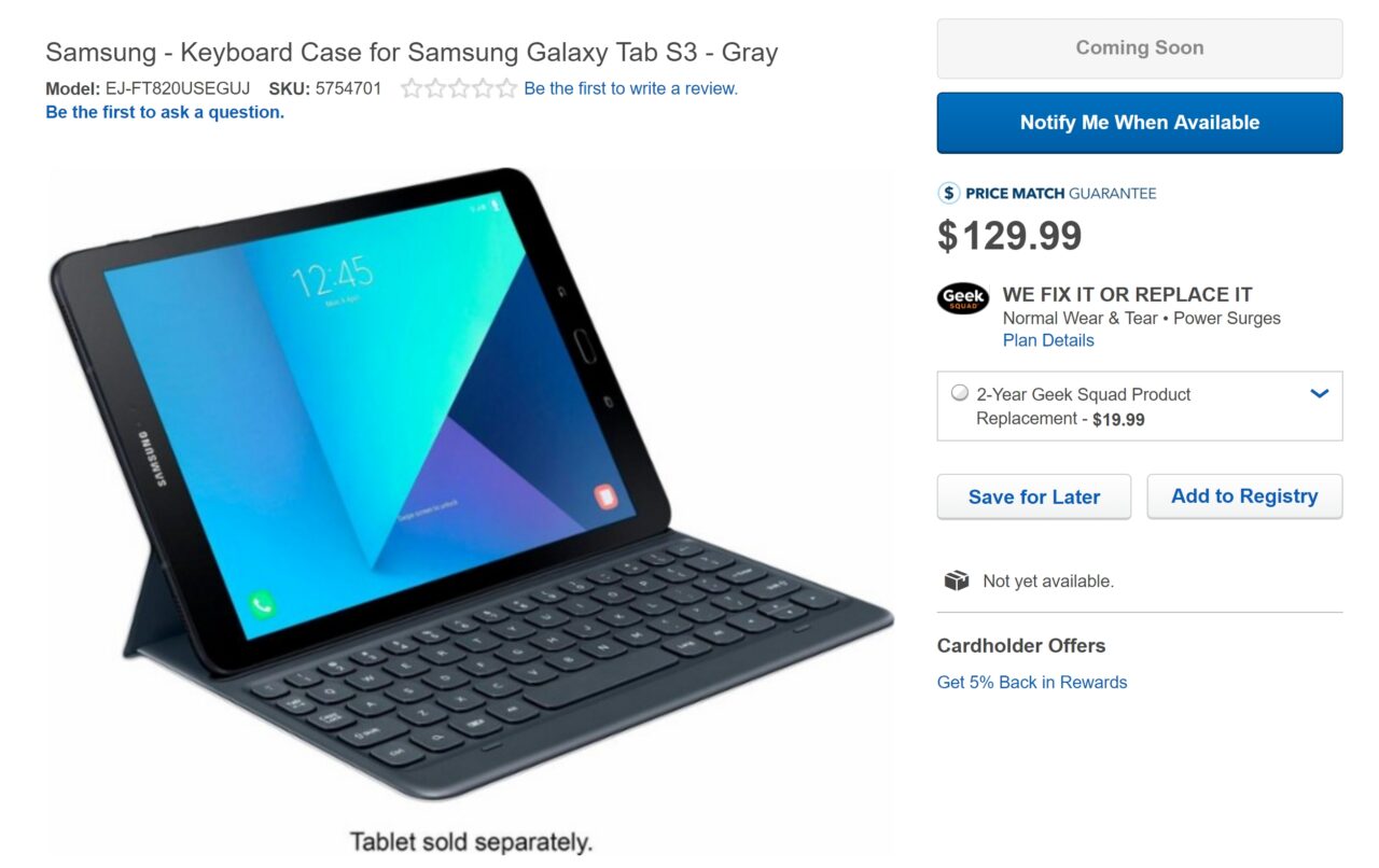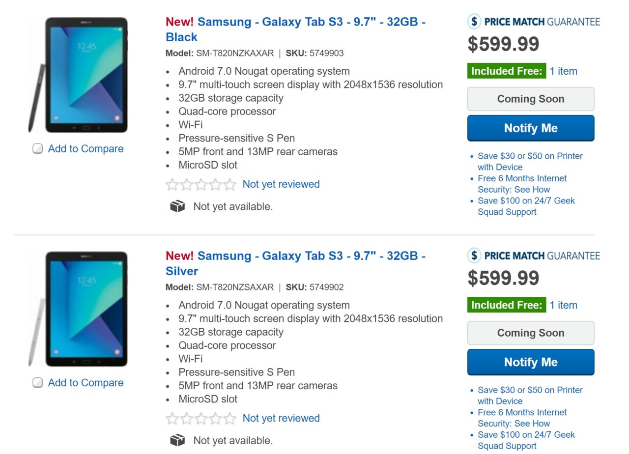 Samsung が MWC 2017 で発表した新型ハイスペックタブレット「Galaxy Tab S3」が米国の大手家電量販店 Best Buy のショッピングサイトに登場しました。まだ販売も予約も開始されていませんが、本体価格などが明らかとなっています。