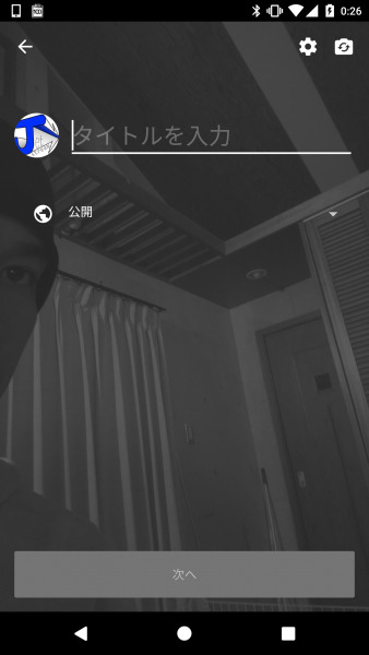 そして「YouTube」アプリのライブ配信を行う際の事前設定画面はこんな感じです。タイトル入力して公開範囲を設定したら、次にサムネイルの写真を撮影します。