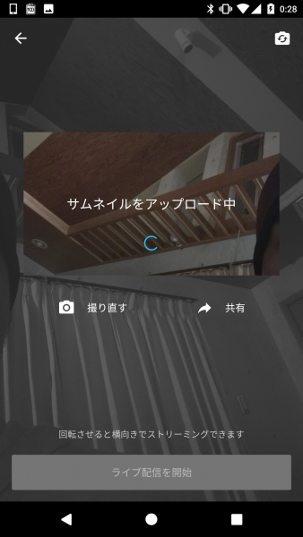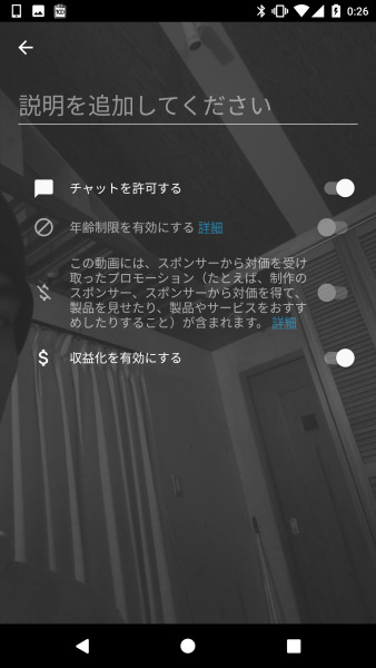 サムネイルを撮影したら “ライブ配信を開始” をタッチすることですぐにライブ配信が行える模様です。ちなみに配信前の設定としてチャットの ON / OFF と収益化の ON / OFF の設定できました。