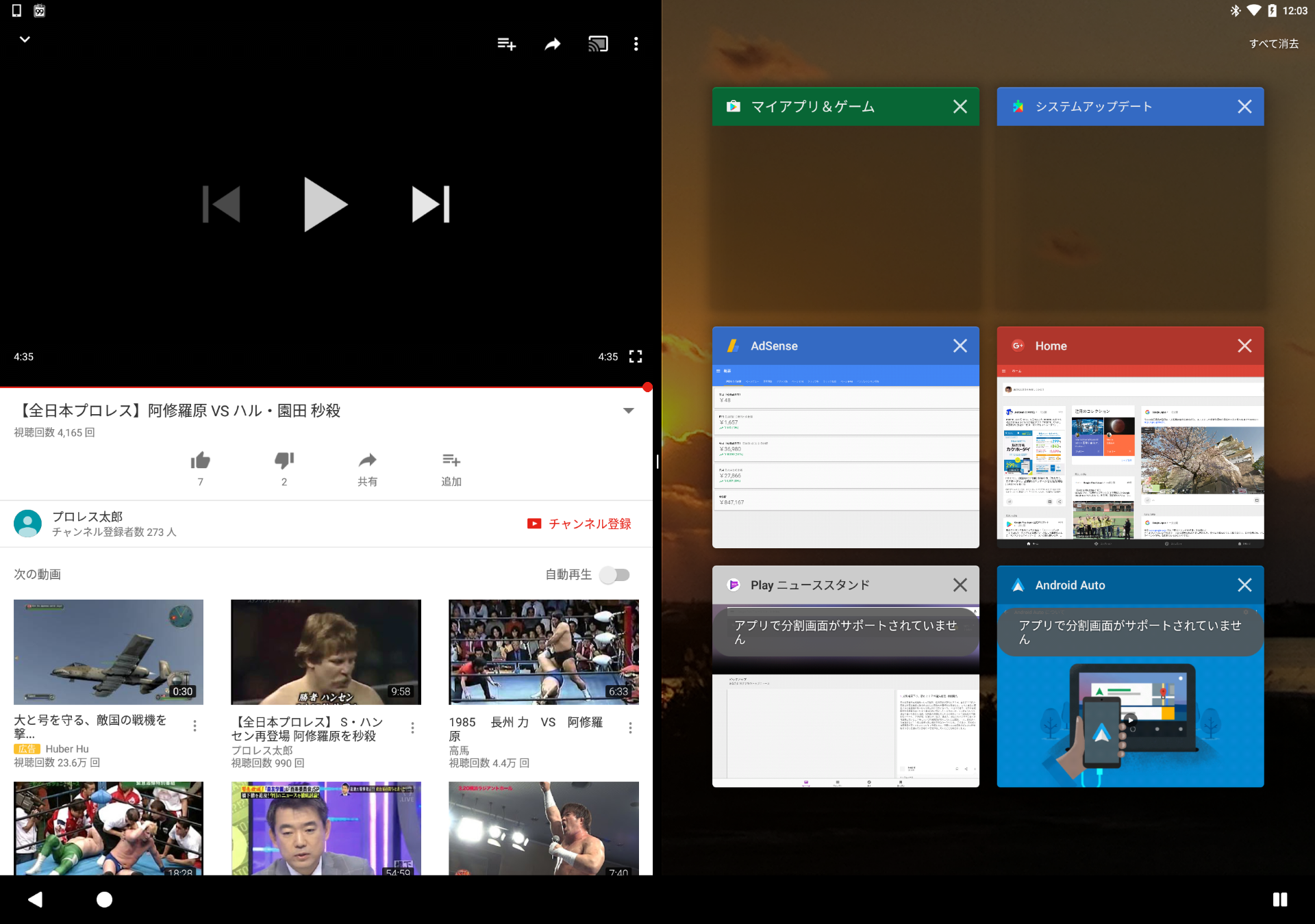 また「Pixel C」のマルチウィンドウ機能ではルチウィンドウを起動したときやタスクボタンをタッチしたときのタスク表示が一覧表示に一新され、分割画面をサポートしていないアプリが一目で確認できるようになっています。