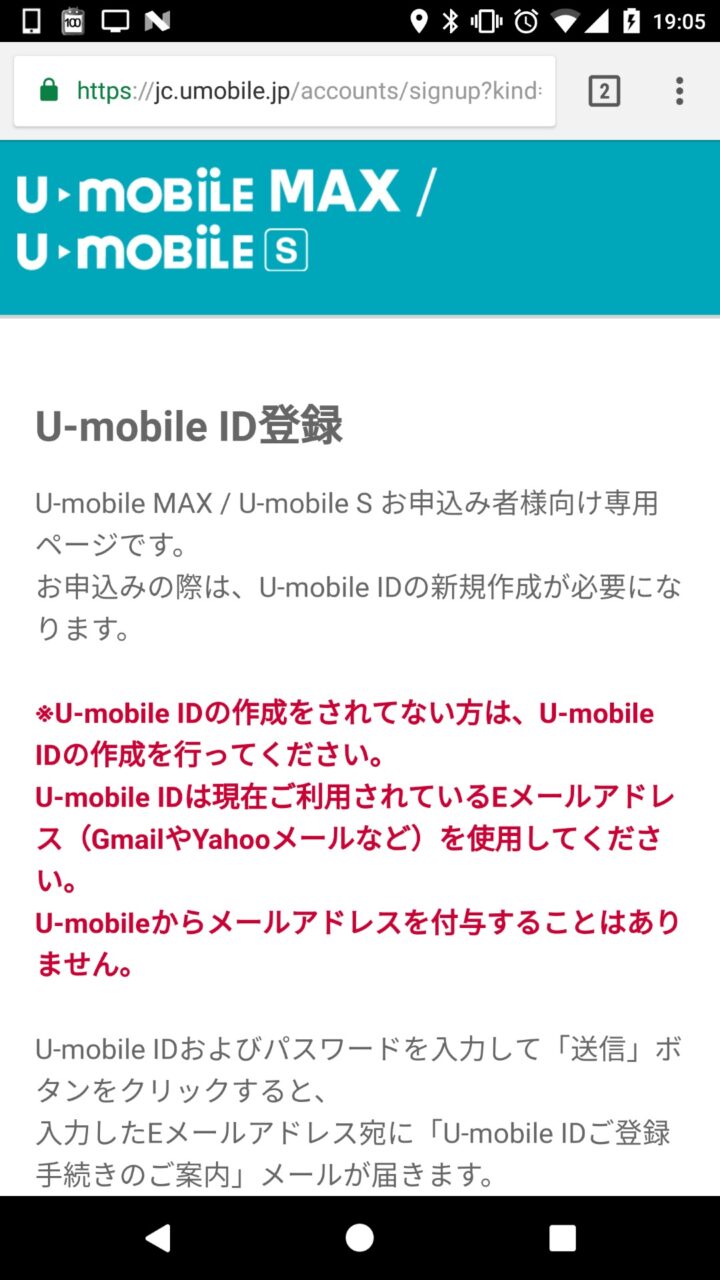 早速開手続きを行おうと思ったのですが、「U-mobile S」を利用するためにはU-mobile ID の取得が必須となる模様。要は会員登録ですね。下記の URL から会員登録を行い U-mobile ID を取得しました。
