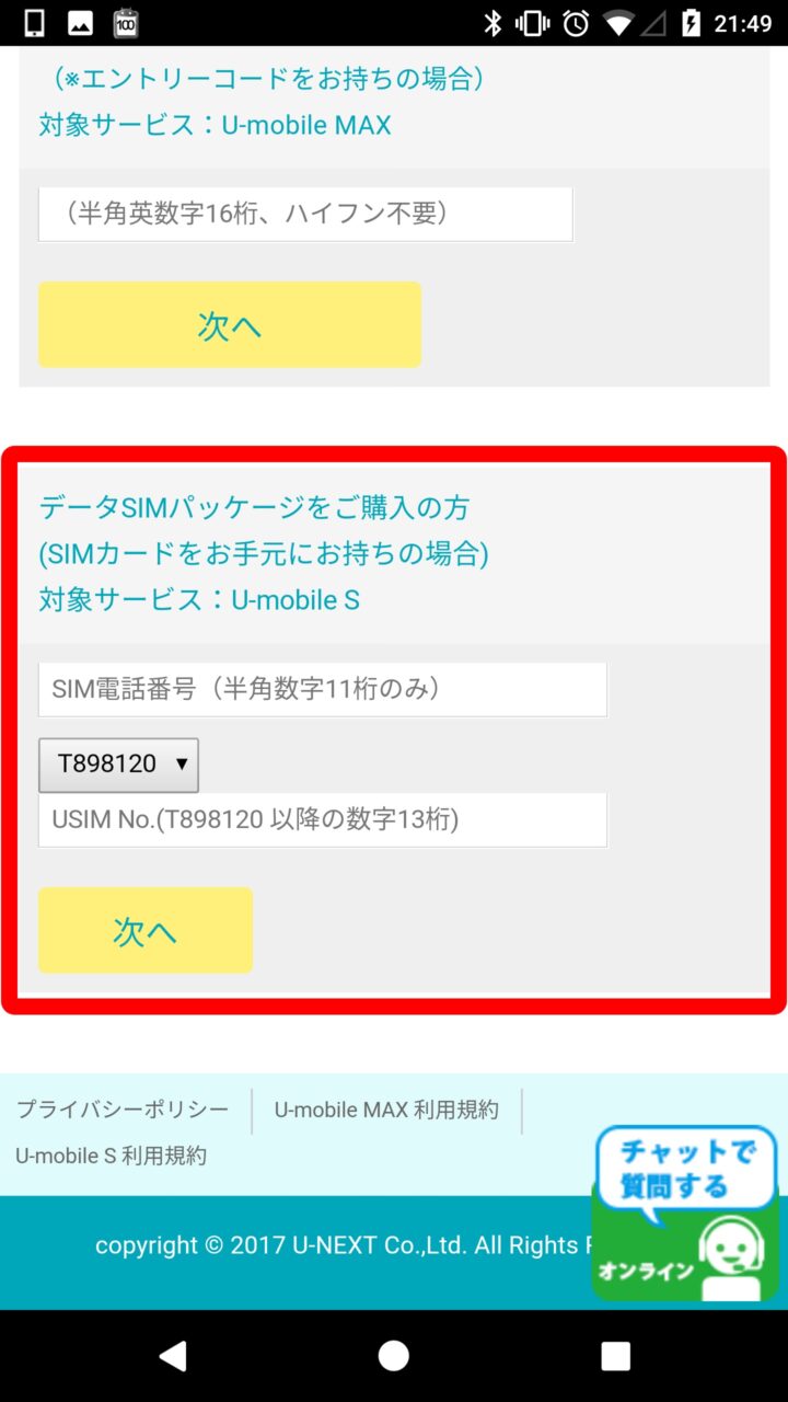 また “お申し込み形態選択” ページもかなり不親切な仕様で、「U-mobile S」だけでなく「U-mobile MAX」というサービスの SIM サイズやプラン選択画面、そしてSIM パッケージ以外の WEB 申し込み(新規)の項目などが混在している始末。この中から “SIM パッケージをご購入の方” を探してそこに SIM パッケージに同梱されている SIM カードの電話番号と SIM 製造番号を入力して進みます。“SIM パッケージをご購入の方” は “お申し込み形態選択” ページ一番下にあります。