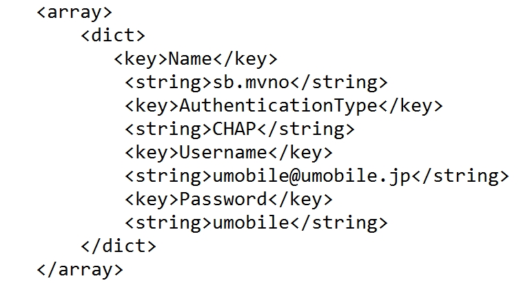 「U-mobile S」と日本通信の同様サービス「b-mobile S」は当初、SoftBank の SIM ロック済 iPhone と iPad、他キャリアを含む SIM ロックを解除済の iPhone と iPad、SIM フリーの iPhone と iPad 専用としてサービスが発表されていました。そのため IMEI などで制限を掛けているのかと思いきや、ただ単に APN 情報を公開しておらず iPhone と iPad 用に APN プロファイルを公開しているだけという内容だった模様です。その APN プロファイルには APN 情報がきっちりと記載されているので、APN を調べることはかなり容易でした。