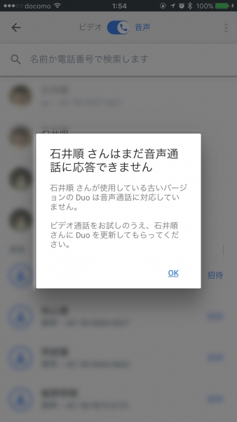 ただし「Google Duo」の音声通話は相手側も v9.0 にアップデートされていないと利用できません。音声通話を行おうとしている相手のアプリバージョンがが v9.0 未満の場合は以下のようなアラートが表示されます。そしてこの状態の相手には音声通話を行うことはできません。