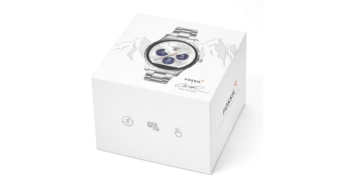 「Fossil Q x Cory Richards」は世界の冒険家コーリー・リチャーズ と Fossil がコラボした限定モデルです。発表当時は現行の「Fossil Q Marshal」と似ていると思われていましたが、スペックを見る「Fossil Q Marshal」と同じとなっていることがわかるため、単に「Fossil Q Marshal」をベースにウォッチリストやパッケージを特別仕様に変えているだけと予想されます。