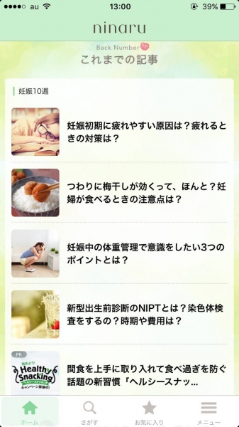 またアプリではこれまでに配信された記事のバックナンバーも読むことができます。特に初めて妊娠される方や初めて子供を授かったご夫婦などはこういった記事を読めばいろんな疑問や不安が解消されるので安心。妊婦さんは辛くても薬を飲むことなどができないでしょうし、こういった記事を読んで不安を解消することはかなり大事なことかと思います。