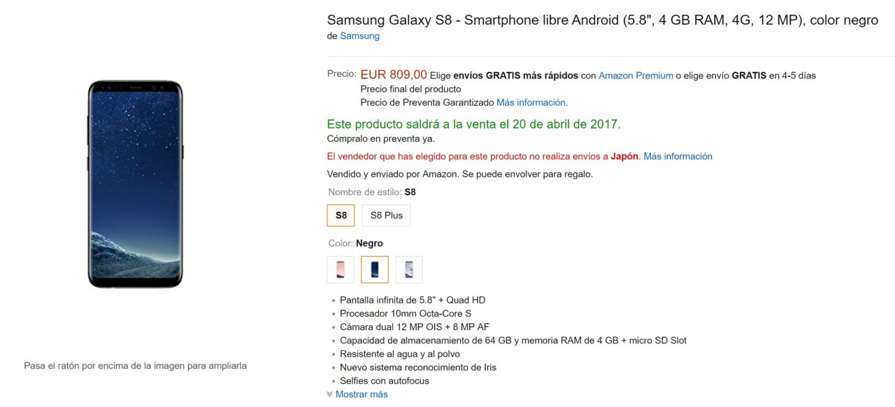 欧州の Amazon における「Galaxy S8」「Galaxy S8+」の本体価格は VAT 込で「Galaxy S8」が €800、「Galaxy S8+」が €900 程度です。Amazon.es では「Galaxy S8」が €809、「Galaxy S8+」が €909 という価格設定となっています。
