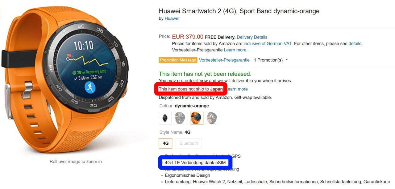 そのため当初は Amazon.de が「Huawei Watch 2」のセルラーモデルを発売して直輸入が可能となったとして eSIM によるのセルラー機能が日本で利用できない可能性があったのですが、SIM スロット搭載モデルに変更されたことにより輸入して日本で利用できる可能性が高くなりました。