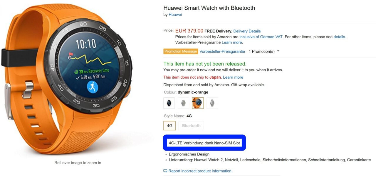当初は SIM スロットを搭載しないセルラー機能の eSIM 対応として表記されていたドイツ Amazon.de の「Huawei Watch 2」が、いつのまにか nano SIM 表記に変更されていました。まだ発売されていないので実際のところどうなのかはわかりませんが、変更されたということは SIM スロットを搭載するモデルでのドイツ展開となる可能性が非常に高くなったといえます。