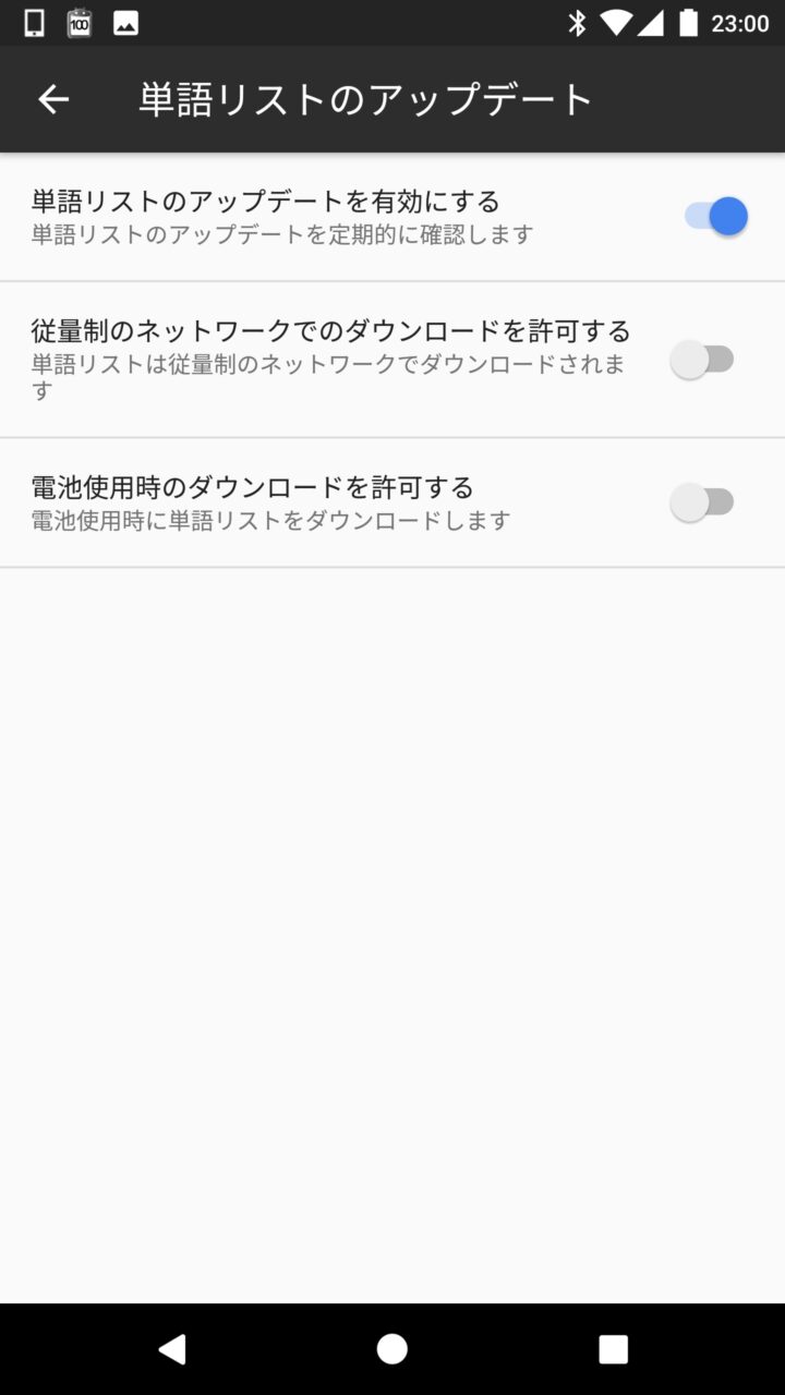 このほか設定項目一番下の “電池使用時のダウンロードを許可する” のスイッチは、充電時に “単語リストのアップデート” を行うかどうかの設定項目となります。