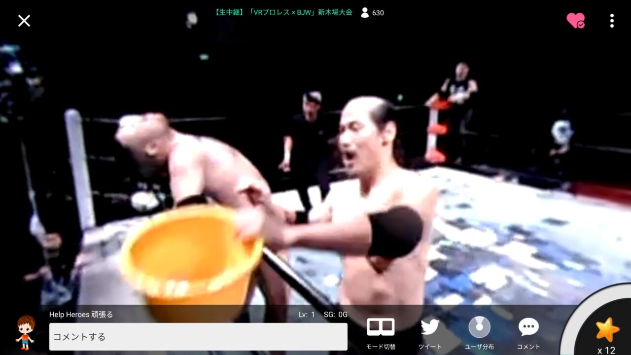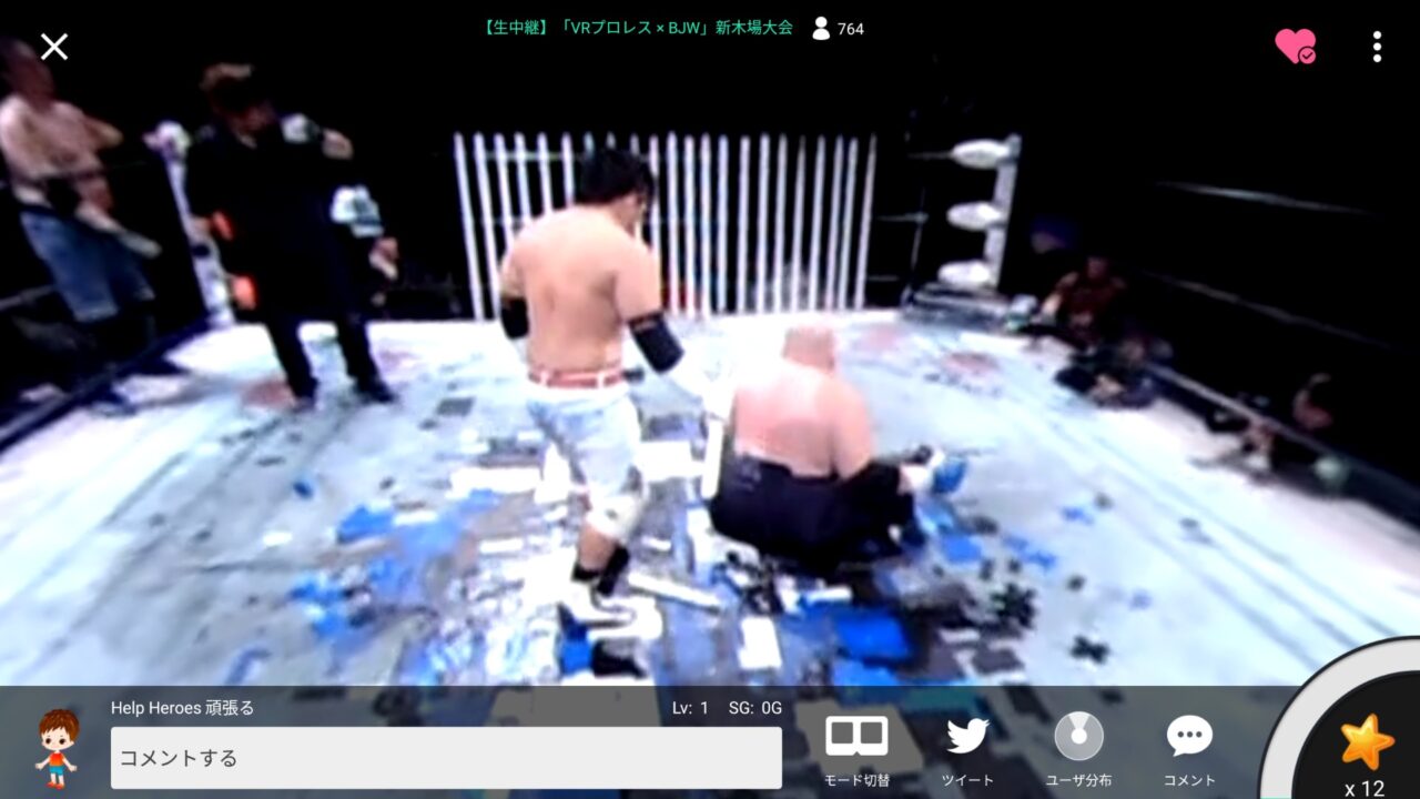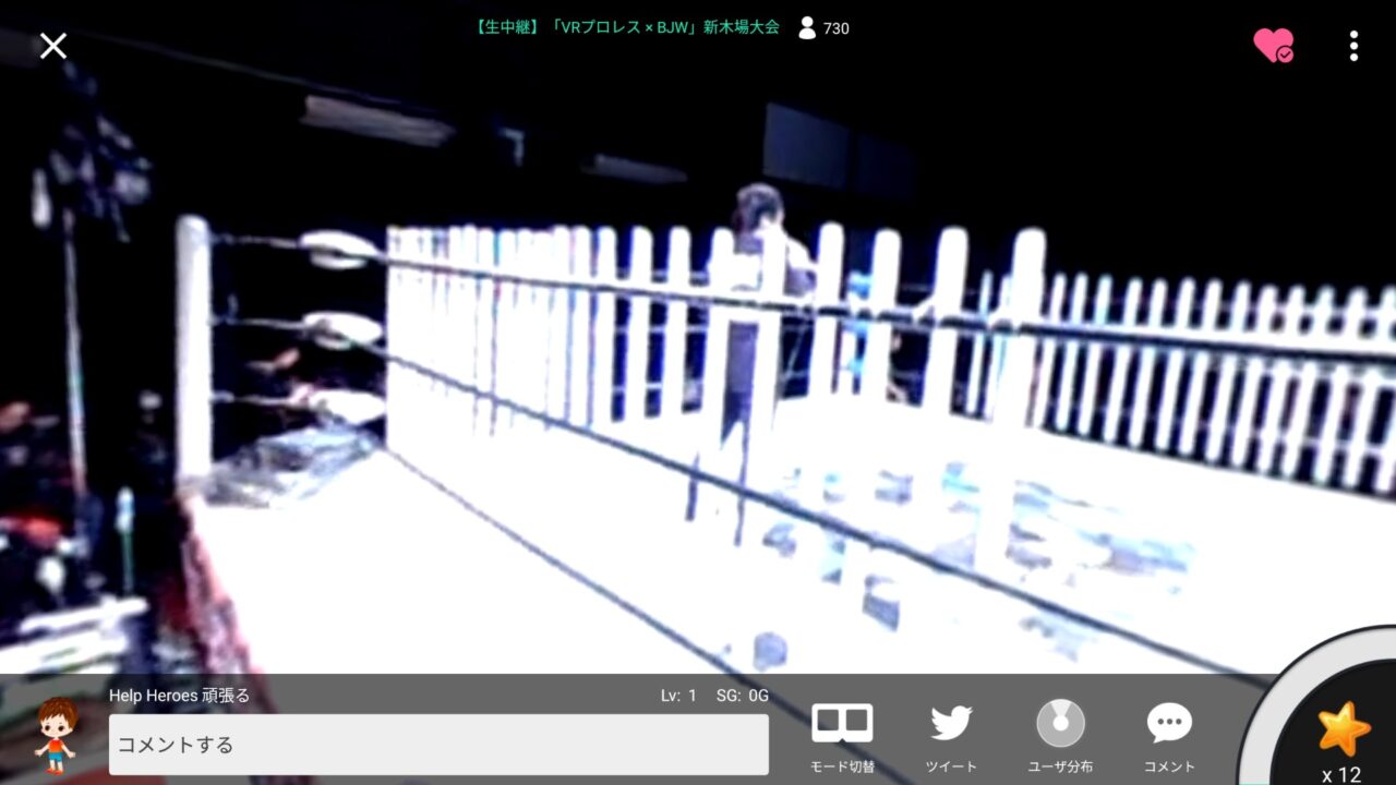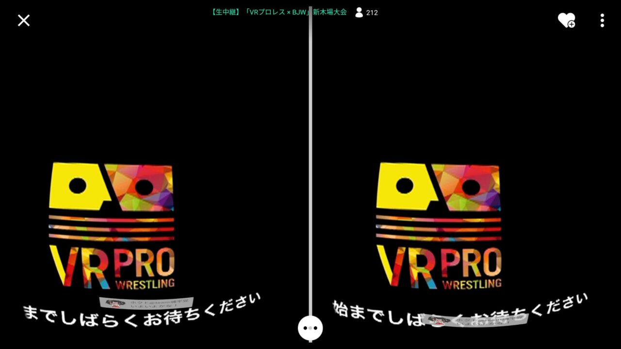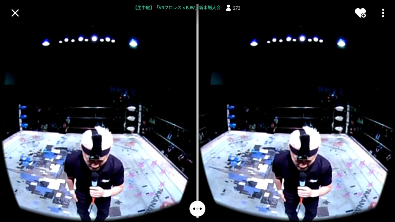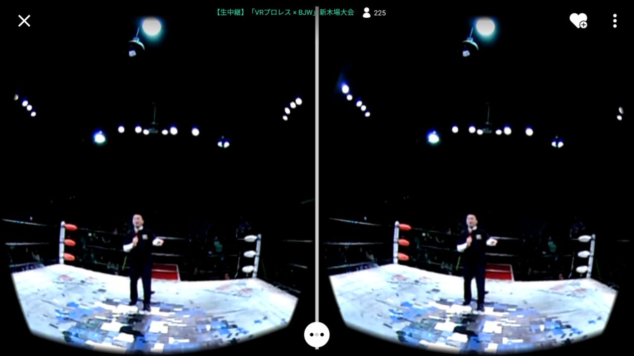 当日はプロレスの第 4 試合からということもあり 19 時半丁度からというわけではなかったのですが、私は Android スマートフォンに「SHOWROOM」アプリをインストールしてスタンバイしていたら 19 時半過ぎ頃から映像の配信が開始されました。視聴方法は全画面モードと VR ヘッドセッドモードがあり、せっかくなので VR ヘッドセットに設定。(最初は)