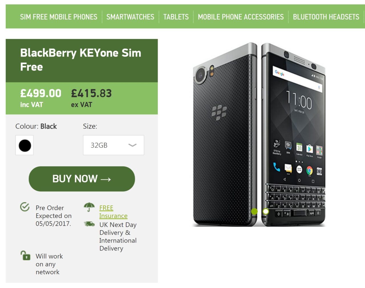 UNLOCKED MOBILES での「BlackBerry KEYone」の本体価格は VAT 抜き £415.83 で、Clove での価格設定とまったく一緒です。恐らく英国での「BlackBerry KEYone」の公式価格が VAT 込 £499 となるためでしょう。